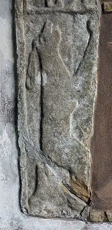 Two fragments of a 14th-century grave stone are attached to the inner wall of the porch depicting a coursing hare and Lombardic lettering[1] possibly relating to the legend of Melangell, which some antiquaries have tried to connect with the hare iconography seen at Pennant Melangell, which once received the tithes of the township of Bryn.[7]