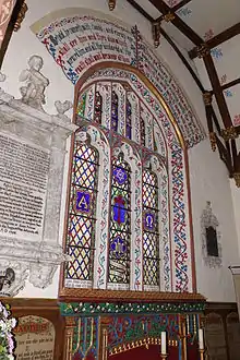 The 15th century rood screen is carved with vines and animals.[1] Parker covered the walls with large scripture quotations. A double-decker pulpit was installed.
