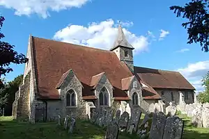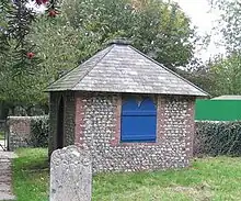 The churchyard has "an outstanding collection" of carved limestone headstones, many allegorical but others depicting real events.[20][12] Several depict nautical scenes: HMS Torbay on fire in Portsmouth Harbour, commemorating a sailor who died in 1758; another dated the following year showing Dublin Bay, where the deceased sailor's ship sank; and another depicting an unidentified ship commemorating a seaman who was press-ganged.[12] The grave-watchers' huts, built in 1829–30,[12] stand at the northwest and southeast corners of the churchyard. They are of galleted flint with red-brick dressings and quoins, hipped roofs laid with slate tiles, and pointed arched entrances and windows with shutters.[13][21] The southeastern hut has a stone chimney;[21] the northwestern hut lacks one but is larger, having been extended,[13] and was also used as a tool-shed.[12]