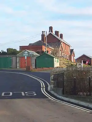 Immediately to the north west of the station the railway passed over Staithes Viaduct, built in 1875 but not opened to railway traffic until 1883 along with the rest of the railway.[10] The viaduct was built of iron and concrete and was 152 feet (46 m) high and 790 feet (240 m) in length.[12] Due to the strong winds in the area, trains could only cross at 20 miles per hour (32 km/h) in windy conditions, and the viaduct was closed completely in high winds.[13] Following closure of the line, the viaduct was demolished in 1960. A plaque near the site of the viaduct details the history of both the structure and the railway.