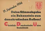 Due to the post-war situation in Germany, the SMAD appointed state administrations in all subdivisions of their occupation zone in July 1945. Wilhelm Höcker became the president of the state administration in Mecklenburg and was later elected minister-president. The first election for the state diet, the Landtag of Mecklenburg-Vorpommern, was held on 20 October 1946, on the same day the elections for the Landtage of the other divisions in the Soviet occupation zone were held. The Soviet-backed SED (which became the ruling party of East Germany from 1949 onwards) received 49.5% of the votes, CDU 34.1%, LDPD 12.5% and VdgB 3.9%.[2] In February 1947, a state constitution was adopted.[3] However, all resolutions by the parliament were made subject to approval of the SMAD.