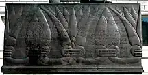 The "larger-than-life", full length statue stands above a plinth adorned with a lotus blossom design and a concrete base with an anti-graffiti coating.[1] The base includes rosettes and a bronze plaque.[1] One inscription below the statue reads the text of the tablet in English, Akkadian cuneiform and Aramaic. The text "Ashurbanipal, King of Assyria, 669–627 B.C." appears above and the text "Dedicated May 29, 1988" appears below, both in English.[7] Another inscription below the statue reads, "Presented to the City of San Francisco by the Assyrian Foundation for the Arts through donations of American Assyrian Association of San Francisco / Assyrian American National Federation", followed by a list of names of donors.[7] In December 2010, the San Francisco Chronicle reported that a large plaque from the sculpture was missing.[8]