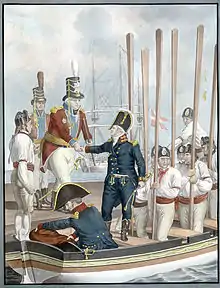 At Toldboden (The Customs House), Major General Heinrich Ernst Peymann says goodbye to Vice Admiral Steen Andersen Bille, who is heading out for an attack on the British Navy on 17 August 1807.