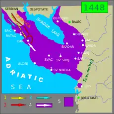 Stefan Vukčić Kosača's offensive into Zeta (1441–44). Podgorica and Medun, in Upper Zeta, and Bar, in Lower Zeta, were conquered.