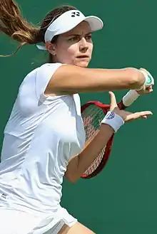 Vögele then played at the Gastein Ladies where she defeated Julia Görges 7–6, 6–2 in the first round.[58] In the second, she upset fifth seed Elina Svitolina, 6–2, 7–5.[59] In the quarterfinals, she lost to fourth seed and eventual champion Andrea Petkovic.[60] At the İstanbul Cup, Vögele defeated Tsvetana Pironkova in the first round 6–4, 7–5. In the second, she lost this time to fourth seed Svitolina, 0–6, 3–6.[61] At the Baku Cup, Vögele defeated Alexandra Cadanţu in the first round 6–1, 6–4. In the second round, she upset top seed Sorana Cîrstea 6–1, 6–1.[62] In the quarterfinals, she won against last year finalist Shahar Pe'er 6–2, 2–6, 6–4 to reach her first semifinal of the year. In the semifinals, she lost to fifth seed and eventual finalist Bojana Jovanovski in three sets.[63]