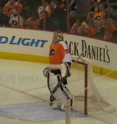 Mason was traded on April 3, 2013, to the Philadelphia Flyers for goaltender Michael Leighton and a 2015 third round draft pick.[14] On April 8, Mason signed a one-year contract extension worth $1.5 million.[15] Mason had four wins and two losses in Philadelphia and posted an impressive 1.90 GAA and a .944 save percentage, leading to speculation that Mason would replace Ilya Bryzgalov as the starter for Philadelphia.[16] In the off-season, on June 25, 2013, Bryzgalov was bought-out by the Flyers,[17] where the team subsequently signed goaltender Ray Emery, effectively promoting Mason to the starter's role.[18] On November 12, 2013, Mason recorded his first shutout for Philadelphia against the Ottawa Senators in a 5–0 win.[19] On January 18, 2014, Mason signed a three-year contract extension with the Flyers worth $12.3 million for an annual average of $4.1 million.[20] Mason finished the 2013-14 season with a 33-18-7 record and a .917 save percentage, which was enough to bring the Flyers to the playoffs. In the playoffs, Mason started 4 games and played in 5, going 2-2 with a 1.97 GAA and a .939 save percentage, but the Flyers were eliminated by the New York Rangers in 7 games.