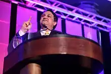 On the second day of the convention, delegates voted by senatorial district for the position of State Chairman. Munisteri won 13 districts, Adams won 12 districts, and Mechler won 6 districts. Since no candidate received a majority of districts, a vote was held in the nominations committee of the convention, and Munisteri won the second ballot by a count of 22–9. After the nominations committee presented their results to the full convention, Adams then proceeded to force an unprecedented floor vote for the position, at which point Tom Mechler officially endorsed Munisteri's candidacy. Munisteri then addressed the full convention and declared that his differences with Adams are "insignificant to the duty we have to our country." He placed the reelection of Perry as top priority and then the regaining of Republican majorities in the U.S. House of Representatives and the U.S. Senate. He added, "there's no question we have to get rid of that man in the White House," a reference to U.S. President Barack Obama.[15] In the ensuing floor vote, Munisteri prevailed with a margin of 4,170 to 2,950 for Adams.[16]