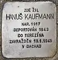 Hanuš Kaufmann, also Hans Kaufman, was born on 20 April 1917 in Prague. He was the son of Hugo Kaufmann and Olga née Ehrmann. He had two older brothers, Bedřich (born 1911) and Robert (born 1913). He was a clerk and single. His last residence before deportation was in Prague II, Soukenická 14. On 13 July 1943 he was deported from Prague to Theresienstadt concentration camp by transport Di. His number on this transport was 292 of 839. On 1 October 1944 he was deported to Auschwitz concentration camp by transport Em. His number on this transport was 521 of 1,501. His lost his life on 19 January 1945 in Dachau concentration camp.[7][8]