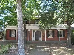 The Stone House, also known as the Walker-Stone House, is a historic house at 207 Center Street in Fayetteville, Arkansas. It is a two-story brick building, with a side-gable roof, a two-story porch extending across the front, and an ell attached to the left. The porch has particularly elaborate Victorian styling, with bracketed posts and a jigsawn balustrade on the second level. The house was built in 1845, by David Walker, and is one of a small number of Fayetteville properties to survive the American Civil War (although it was damaged by a shell). It was owned for many years by the Stone family, and reacquired by a Stone descendant in the late 1960s with an eye toward its restoration.[2]