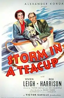 Storm in a Teacup is a 1937 British romantic comedy film directed by Ian Dalrymple and Victor Saville and starring Vivien Leigh, Rex Harrison (in his first starring role[2]), Cecil Parker, and Sara Allgood. It is based on the German play Sturm im Wasserglas by Bruno Frank, as well as the English-language adaptations: London's Storm in a Teacup and Broadway's Storm Over Patsy, both written by James Bridie.[3] A reporter writes an article that embarrasses a politician. Meanwhile, the newspaperman is also attracted to his target's daughter.
