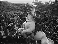 Eisenstein's editing is rapid, even compared to other Soviet filmmakers of the era. Strike has an average shot length of 2.5 seconds, less than half that of a typical Hollywood film.[17] Dissolves, traditionally used to indicate the passage of time between shots, are used instead as a visual effect. In some scenes, the aspect ratio is dynamic, with masks in front of the camera being added or removed to change the framing of a shot. The film also makes use of multiple exposures and iris shots.[15][18]