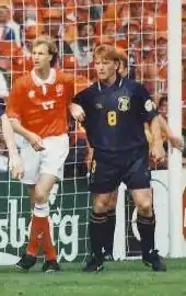 Later the same year, McCall was called up to the Scottish senior team. He won his first cap on 28 March 1990 in a 1–0 friendly victory over Argentina.[66] He played in five friendlies in 1990 which earned him a call up to the Italia 90 World Cup squad. He played in all three of Scotland's World Cup games. They lost their first game 1–0 to Costa Rica, before McCall scored what would be his only international goal against Sweden in a 2–1 victory.[67][68] However, Scotland failed to qualify for the knock-out stage when they were defeated 1–0 by Brazil.[69]