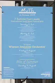 The Summa Cum Laude Festival is an international youth music festival for choirs, bands and orchestras, held annually in Vienna, Austria during July. It takes place in the city's two main classical concert venues, the Golden Hall of the Musikverein and the Konzerthaus. The Festival was established in 2007, hosted by VIA MUSICA (Vienna International Association for Music and Culture Exchange). The following year in 2008, the Summa Cum Laude Festival expanded to include both the Summa Cum Laude Competition as well as the Summa Cum Laude Celebration. Performing groups may elect to compete with their peers in the "SCL Competition" or they may opt to participate in the non-competitive "SCL Celebration."[1][2]