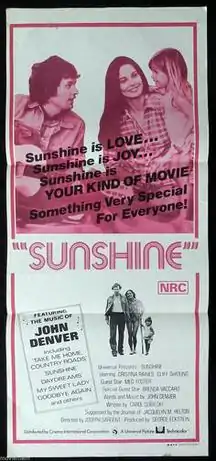 Sunshine is a 1973 American made-for-television docudrama, directed by Joseph Sargent and produced by George Eckstein,[1] about a young wife and mother who dies of cancer at age 20. The film stars Cristina Raines in the lead role of Kate Hayden (Raines' first big movie role), Cliff DeYoung as Kate's husband Sam Hayden, and twins Lindsay and Sidney Greenbush as Jill, Kate and Sam's daughter, as a toddler. It originally aired on CBS as an episode of the CBS Friday Night Movie on November 9, 1973. When first aired, Sunshine was the most watched made-for-TV film in history.[2] The film uses John Denver's song "Sunshine on My Shoulders" as a theme. The song "My Sweet Lady" from the film reached #17 on the Billboard Hot 100 Pop Chart in 1974, and #14 in Canada.[3]