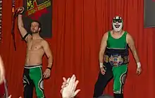 Stupefied (left) and Player Uno (right) as Super Smash Brothers with the Alpha-1 Tag championship belts in 2011