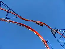 Superman: Ultimate Flight launches out of the station rising up halfway up the first twist. It then returns backwards through the station into the non-inverting loop. Returning forwards and accelerating riders to a top speed of 62 miles per hour (100 km/h). It then travels up to a height of 150 feet (46 m) where it completes a heartline roll (ranking it among the tallest inversions in the world) before exiting in a second non-inverting half-loop at 133 feet (41 m). It then enters the second twist and returns to the station. The ride can be compared to several of Maurer Söhne's X-Coasters. The non-inverting loop element was previously only found in two of the company's X-Car roller coasters prior to Premier Rides' installation of Superman: Ultimate Flight.[20] Additionally, the ride bears several similarities to the SkyLoop model including design, height and speed.[21][22] On speakers outside the attraction entrance, John Williams' score is played in a loop.