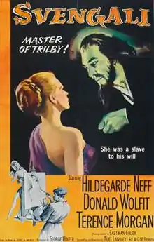Svengali is a 1954 British drama film directed by Noel Langley and starring Hildegard Knef, Donald Wolfit and Terence Morgan,[1] based on the 1894 novel Trilby by George du Maurier. Svengali hypnotises an artist's model into becoming a great opera singer, but she struggles to escape from his powers. It was distributed in the United States by Metro-Goldwyn-Mayer.