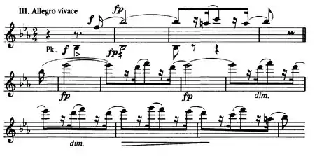 The work is scored for an orchestra of two flutes, piccolo, two oboes, English horn, two clarinets, two bassoons, four horns, two trumpets, three trombones, tuba, timpani, triangle, harp, and strings.[11]