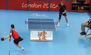Table tennis at the 2012 Summer Paralympics in London took place from Thursday 30 August to Saturday 8 September 2012 at ExCeL Exhibition Centre. 276 athletes, 174 men and 102 women, competed in 29 events.[1] Table tennis events have been held at the Paralympics since the first Games in Rome in 1960.[2]
