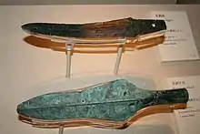 Bronze dagger and bronze spearhead from the Bronze Age. Excavated at Tai Wan and exhibited at the Hong Kong Museum of History.