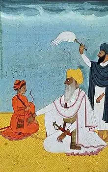 Miniature painting of Tara Singh Ghaiba (middle, yellow turban) with flywhisk attendant to the right and young boy to the left, circa 18th century