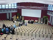 On 14. February 2003, the then minister of science, Hans Zehetmair, laid a foundation for a circular teaching building in Schweinfurt extending to 3000m² and costing almost 14.5 million euros. In the basement of the building there are modern student computer pool rooms. On the first floor a spacious assembly hall (Aula) offers a venue for events and conferences. arranged in a circle around the central space are deans' offices, administrative offices and the largest auditorium of the building. On the second and third floor of the building, constructed of reinforced concrete and aluminium, there are air-conditioned multimedia rooms. The building was opened by the minister of science, Thomas Goppel, on 4. October 2004. Since then, most of the courses in Schweinfurt have been held in these new premises. The older buildings in Schweinfurt have mostly been vacated and since 2004 been extensively refurbished.