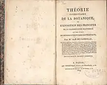 Théorie Élémentaire de la Botanique is a book written by Swiss botanist Augustin Pyramus de Candolle, which was first published in 1813 and later re-issued in 1819 with a new edition.[1] This book contributed to the field of botany by introducing the use of the term taxonomy and a new classification system for grouping plants together. This book placed emphasis on the study of evolutionary relationships in grouping plants together, rather than on shared morphological characteristics.[2]