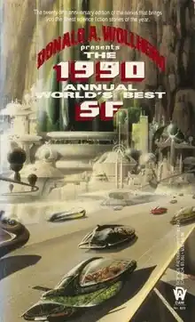 The 1990 Annual World's Best SF is an anthology of science fiction short stories edited by Donald A. Wollheim and Arthur W. Saha, the nineteenth volume in a series of nineteen. It was first published in paperback by DAW Books in July 1990, followed by a hardcover edition issued in August of the same year by the same publisher as a selection of the Science Fiction Book Club. For the hardcover edition the original cover art of Jim Burns was replaced by a new cover painting by Richard Powers.