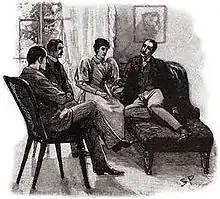 ![]() Holmes, Watson, Annie Harrison and Percy Phelps, 1893 illustration by Sidney Paget in The Strand Magazine | |||