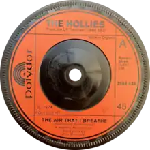 "The Air That I Breathe" was a hit for the Hollies in early 1974, reaching number two in the UK Singles Chart. In mid-1974, it reached number six in the United States on the Billboard Hot 100 chart and number three on the Adult Contemporary chart.[5] In Canada, the song reached number five on the RPM magazine charts. This version featured a string orchestra arrangement, which also featured a horn section. Record World said that "the potent material gets a super interpretation."[6]