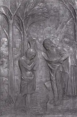 Baptism of Christ is a rectangular stiacciato marble relief of the Baptism of Christ, showing a crowd in the background, including a servant holding a towel to the left and an angel to the right. It measures 63.5 by 40.5 cm and dates to 1425, forming part of the decoration of the font in Arezzo Cathedral.