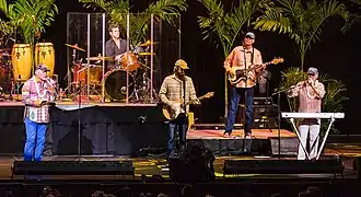 Mike Love (far left) and Bruce Johnston (far right) performing as the Beach Boys in 2014, with occasional guest-performer John Stamos on drums (back)