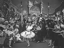 Méliès appears in the film as one of two men who join the chase scene together; Emile Gajean is the other.[6] The ballet in the film is performed by the corps de ballet of the Théâtre du Châtelet,[7] and was choreographed by Madame Stitchel, their director. Stitchel also choreographed dances for other Méliès films, including Under the Seas.[8] The Ping-Pongs, an English company of dancing girls, played the Troops of Dream Country.[9] Unusually for Méliès, the chase scenes were filmed outdoors:[10] each of these exterior scenes was staged on a different part of Méliès's own property in Montreuil, Seine-Saint-Denis.[5] Special effects in the film were created using stage machinery,[5] substitution splices, superimpositions, and dissolves.[11]