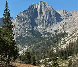 The Citadel is an 11,738-foot-elevation (3,578-meter) mountain summit located in the Sierra Nevada mountain range, in Fresno County of central California, United States.[3] It is situated in northern Kings Canyon National Park, 20 miles (32 km) west-southwest of the community of Big Pine, and 2.4 miles (3.9 km) south of Langille Peak. Topographic relief is significant as it rises 3,400 feet (1,000 meters) above Le Conte Canyon in approximately one mile. The long approach to this remote peak is made via the John Muir Trail. The Northeast Arête, also known as Edge of Time Arête, is considered one of the classic climbing routes in the Sierra Nevada.[5]