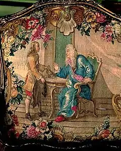 During the 18th-19th centuries, the term proverbe was being applied to moralised dramatic pieces of one act, which had become popular because they could be played without the need of a stage and allowed for improvisation.[34] Le Savetier et le Financier was one such 'proverb' that, according to her memoirs, was acted in her dining room by Stéphanie Félicité, comtesse de Genlis and two of her friends in pre-revolutionary days.[35] A typical script of this kind furnishes the proverb that serves as its moral. Contentement Passe Richesse by Claude-Louis-Michel de Sacy (1746–94), for example, appeared in 1778 and there the French proverb provides the cobbler with his final words as he confronts the financier and hands him back his money.[36] Similarly, in Le Savetier et le Financier, one of the pieces in the Proverbes dramaticques (1823) of Théodore Leclercq (1777-1851), the cobbler becomes reconciled with his wife after returning the money and they repeat together "Better than wealth is content" at the end.[37]