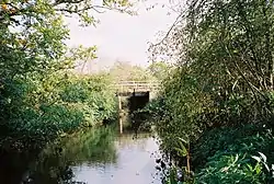 Beyond the junction, the river turns to the south west, passing under Osbourne Lane and then running between Scotlands Farm and Newell Green to pass under the A3095 road at Bott Bridge. In 2016, some 110 yards (100 m) of the river downstream from the bridge were diverted, to allow a roundabout to be constructed on the B3034, and an access road to a new housing development to cross the river. The project included the creation of a floodwater retention pool, with the associated controls to manage it, and the use of woody material to create backwater habitat along the length of the diversion.[15] As the river passes the end of Watersplash Lane, it is joined by a small tributary flowing north-west from Green Acres, and continues under Harvest Ride. After it reaches Frampton's Bridge, carrying the B3018 road, it is joined by the Downmill Stream, emerging from a culvert.[10] This tributary begins at Gormoor Pond, to the south of a road called Nine Mile Ride, and apart from two lakes at South Hill Park and the Mill Pond at Wildridings, is culverted for most of its 3.3-mile (5.3 km) length. Prior to the establishment of Bracknell, it ran past Downmill Brickworks, on the north side of the railway line.[16] By 1972, the section between the railway and the junction with the cut had been culverted, but south of the railway it was still in the open.[17] Mill Pond was originally what its name suggests, but was enlarged to act as a balancing pond when Bracknell was constructed. It now covers an area of 6.5 acres (2.63 ha).[18]