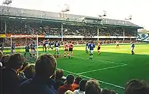 The site on which the ground was built was described in Philip Brannon's Picture of Southampton, published in 1850, as "a lovely dell with a gurgling stream and lofty aspens";[5] the stream is the Rollsbrook which flows out of Southampton Common, running parallel to Hill Lane before now disappearing under Commercial Road and the Central Station, from where it is conduited under Southampton Docks into Southampton Water. The land had been purchased in the 1880s by the Didcot, Newbury and Southampton Railway to enable them to continue their line from Winchester via Twyford, Chandlers Ford, a tunnel at Chilworth and Shirley where it was to pass to the north-east of what is now St James' Park and St. James' Church. From here the line would have travelled south across Hill Lane to run through the dell and onto an embankment leading to a viaduct over Commercial Road and the London and South Western Railway line before terminating on the Western Esplanade, north of the Royal Pier.[6][7] The dell was stripped of vegetation and the stream channelled into a conduit with work started on the embankment, which survives behind property to the north of Commercial Road but was never used, and the viaduct which was part built but later demolished. The project was abandoned at this point and agreement reached to connect to the London and South Western Railway at Shawford Junction with running rights into Southampton.