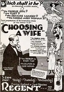 ![]() Advertisement for the British drama film The Elder Miss Blossom under its alternate American title Choosing a Wife, for the Regent Theater in Pittsburgh, Pennsylvania, August 1919 | |