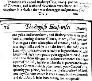 The recipe for "a very good" Banbury cake is probably the earliest published version.[7] It calls for four pounds of currants, washed and dried; three eggs, beaten; yeast ("barm"); sweet spices; a pint of cream and a pint of warm milk; and unstated quantities of flour, butter and sugar. The dough is to be kneaded for "an houre or more", while the cake is to be baked "according to the bignesse".[lower-alpha 1][8] A version of this recipe, adapted for small cakes, was given in The Guardian in 2012.[9]