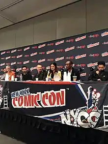 Cast and crew of the series at the 2017 New York Comic Con. From left to right: Producer/writers Jeremy Slater and Sean Crouch; actors Alfonso Herrera, Ben Daniels, Zuleikha Robinson, Kurt Egyiawan, and John Cho.