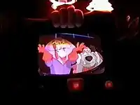 Inside the preshow, there were 3 projection screens: two oval screens and a regular square screen. On one of the oval screens, Yogi Bear appeared pestering guests for food. Boo Boo shows up to inform him that the guests are here for an animation demonstration by William Hanna and Joseph Barbera. The two (live-action) appear on the square screen and begin talking about how they create animated cartoons, leading to Barbera drawing Elroy Jetson, who magically comes to life and jumps out of the paper three-dimensionally. Hanna goes on to talk about computer animation using Dick Dastardly's airplane (in this case, a spaceship).
