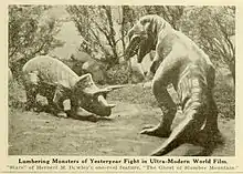 Photograph depicting the fight between the Triceratops and Tyrannosaurus in the film (1919)