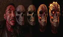 The writers felt that it would be more interesting if Reyes was given the Ghost Rider mantle physically rather than by making a deal "with some disembodied spirit", and decided to tie in with an older idea associated with the comic character in which the mantle is passed from one version of the Ghost Rider to another. They decided to show another Ghost Rider arrive on a motorcycle and "hand off" the mantle to Robbie, which Bell said "promised more story to come possibly, whether now or later. It also plugged into the larger universe."[7] The other Ghost Rider is only referred to as a "Good Samaritan" by Gabe in the episode,[11] but the producers hinted with the character's design and an Easter egg in the previous episode that this was the Johnny Blaze version.[12] This was later confirmed by others involved with the episode,[13][14] with Luna later attributing the lack of onscreen clarification to legal issues.[15] Blaze was originally intended to be the Ghost Rider of the series, and would have been teased in the season three finale, "Ascension", but this was changed to a tease of the Life Model Decoys once Marvel rescinded the series' ability to use the Blaze version of the character.[16] The producers did not intend to explore Blaze beyond his brief appearance in the episode, but Bell did state that he was no longer the Ghost Rider after passing on the Spirit of Vengeance to Reyes, saying that "there is a tradition within the comics that there's been many Ghost Riders and our take on that was they're not simultaneously a tribe of Ghost Riders but that it's passed ... That's as far as we're going to take that part."[12] The character was portrayed, uncredited, by Tom McComas during filming.[17][11]