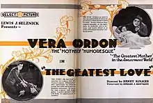 The Greatest Love is a 1920 American silent drama film directed by Henry Kolker and starring Vera Gordon, Bertram Marburgh and Sally Crute. The film follows the fortunes of an Italian immigrant family the Latinis who arrive in New York around the turn of the century. It built on Gordon's previous role as a long-suffering Jewish mother in Humoresque.[1]