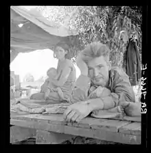 Steinbeck pays great attention to highlight how the Depression has impacted the families in the squatter camps by tracing their economic degeneration, and the intense precision and consistency that their agricultural work demands.[39] He mentions a family that had been very successful farmers,[40] and another that had owned a grocery store.[41] Additionally, he notes the tempered optimism that many new residents had, and works to humanize the squatters: their desire to educate their children, and the loss of loved ones that marks their lives evoke sympathy. With the "filth"[42] and malnutrition of the camps, causes of death are clear to Steinbeck—and, he purports, to the squatters.[43]
