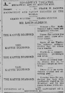 The Kaffir Diamond is an 1888 play. It had its New York City debut at the former Broadway Theatre on September 11, 1888.[1][2][3] Though the audience provided "unbounded applause" on opening night,[4] reviews of the play were negative,[5][6] and it played unsuccessfully for only five weeks, concluding on October 13, 1888.[7][8]