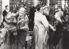 Meanwhile, Horace's head clerk Cornelius Hackl convinces his sidekick Barnaby Tucker that they, too, deserve an outing to New York. The two cause cans of tomatoes to explode, spewing their contents about the store, which justifies their closing it for the day and heading to the city.[2] While there, they come across Irene's hat shop and Cornelius is instantly taken with her. The pair are forced to hide however, when Mr. Vandergelder and Dolly arrive. Though Dolly and Irene cover up for them, Mr. Vandergelder still realizes that Irene is hiding people in her shop (though he doesn't know who) and leaves in disgust. Irene furiously demands that Cornelius and Barnaby repay her by taking her and the shop assistant Minnie out to a fancy restaurant for dinner (Dolly had led her to believe that the men were secretly members of high society).