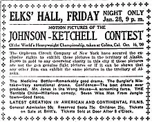 By October 1909, the two split-reel shorts were still being widely distributed and were finally reaching many small-town theaters. A writer that month for the newspaper The Brunswick News in Georgia was highly complimentary of The Medicine Bottle, but, unlike Alfred Greason, he evidently did not even see the film before providing readers with his brief assessment of the production. Possibly confusing the thriller with Jones and His New Neighbors, the reviewer in the October 7 issue of The Brunswick News confidently declares, "'The Medicine Bottle' is another comedy drama full of fun", adding "If this picture does not make you laugh nothing will."[19] Three months laterover 4,100 miles from Brunswick and nearly a year after the release of The Medicine Bottle and its split-reel companioncopies of the shorts finally arrived in the United States territory of Alaska, in the port town of Skagway.[20] There the thriller was advertised on January 27, 1910, issue of The Daily Alaskan as a "Remarkably good drama" and promoted as an upcoming attraction being presented at the local Elks' Hall with the "screaming farce" Jones and His New Neighbors, which the newspaper misidentifies and misspells in its advertisement as "Mr. Jones in the W[r]ong House".[20] Five additional motion pictures were promoted as well on the same bill, with the main feature being footage of the heavyweight championship fight between boxers Jack Johnson and Stanley Ketchel, a bout that had occurred three months earlier in Colma, California before a crowd of 10,000 spectators.[21]