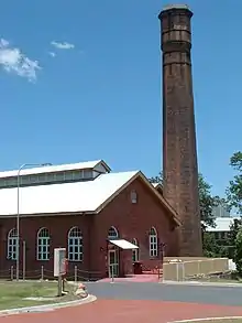 The Power House (1917) is an imposing red brick building with a substantial, octagonal brick chimney at its northwestern corner. It has two steel-trussed gabled roofs clad in corrugated galvanized iron with raised vented roof lantern running the length of the building. It is built on concrete foundations and contains Babcock & Wilcox tube boilers. Regular arched openings are on all sides of the building; some have sets of nine windows and others have doors. All the arches are highlighted externally by the use of bricks of a slightly deeper red tone. Circular windows are located in the gable ends on the northern and southern elevations. The upper floor has recently constructed offices, built as a free-standing series of rooms within the larger interior space of the building. These offices are constructed of plasterboard. Some internal walls are finished to a height of six feet with white enamelled brick with green trim. The huge boilers and other engineering equipment are located on the ground floor.[1]
