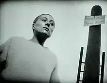Dreyer often shot the priests and Joan's other interrogators in high contrast lighting, but then shot Joan in soft, even lighting.[18] Rudolph Maté's high-contrast cinematography also allowed unappealing details in people's faces, such as warts and lumps, to be fully visible. In addition, Dreyer employed many low-angle shots of Joan's persecutors so that they would appear more monstrous and intimidating; in the effort to do this, several holes were dug on the set for the camera to film from the appropriate angle, causing the crew to nickname him "Carl Gruyére".[7] Dreyer also shot the film "from the first to the last scene...in the right order."[17]